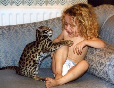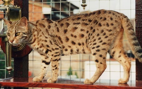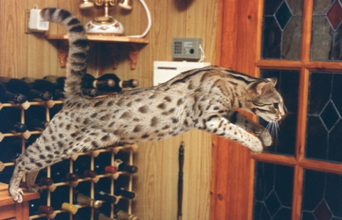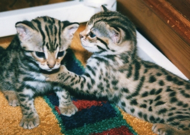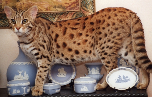 Then, in 2000, one of our leopard cats, Sarez Little L., became the first to hybridise to a domestic cat in Britain, producing a magnificent litter of F1 Bengal kittens! Naturally, we kept the two beautiful females Meena (Sarez Sanura) and Keesha (Sarez Safiya). And then in 2004, a second leopard cat, Sarez Apollo, followed suite!
