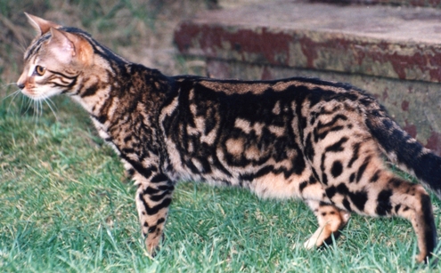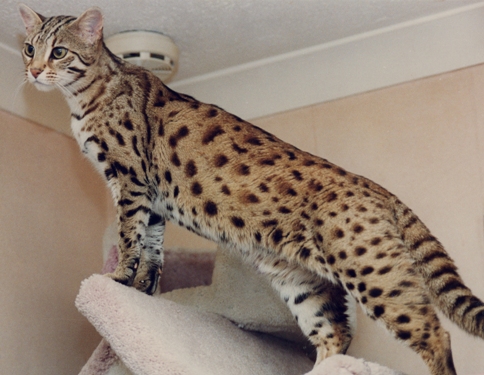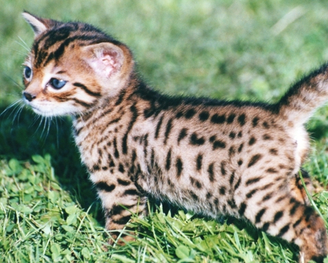 F1 kittens are immensely difficult to breed due to their father, the leopard cat. These wild cats are very hard to obtain, and to be conducive to hybridising, they must be hand-reared around domestic cats (which is hard in Britain due to the strict Dangerous Wild Animal licensing laws) and never with wild cats. If one can’t obtain or breed such a cat and instead attempts to use a wild, parent-reared leopard cat, he simply won’t hybridise and if panicked, he could kill or seriously injure a Bengal female. And even if a leopard cat is hand-reared around domestics, only about 1 in 15 will hybridise due to their dislike of the domestic smell. Female leopard cats should not be used because the resulting F1 offspring have domestic physical features due to the genetics of the process - it is only the male leopard cat who passes down the wild look that Bengals needs. And so, with all these factors considered, the odds are greatly stacked against hybridisation taking place.