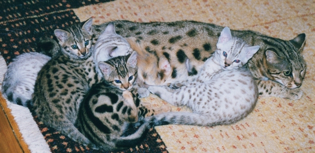 Upon visiting our home in 1995, Jean Mill, the predominant founder of the Bengal breed, told me: “If an F1 is difficult, take her babies away at four weeks old otherwise she tells them wicked things about people, and makes them behave badly”. A charming way of explaining an important point regarding wilder F1 mothers… but I felt proud that due to the temperaments of our cats, we almost never have to do that.
