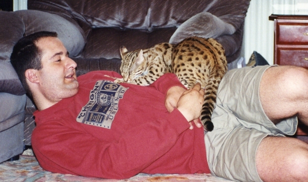 In 2003, Sarah and I took this one stage further and bred one of our high wild blood females, Pow Wow, back to the leopard cat and created Sarez Zeus, who’s believed to be the world’s only 90% wild blood F1. Again, this ultra wild looking cat was handled intensively from birth and today he remains as tame and as friendly as most domestics are.