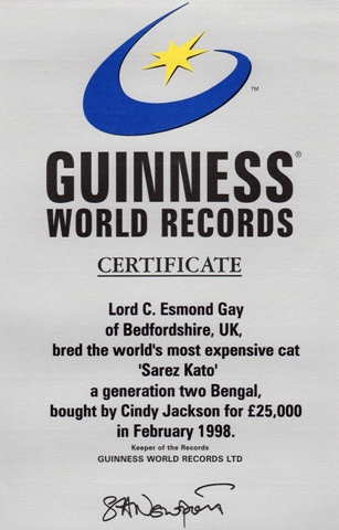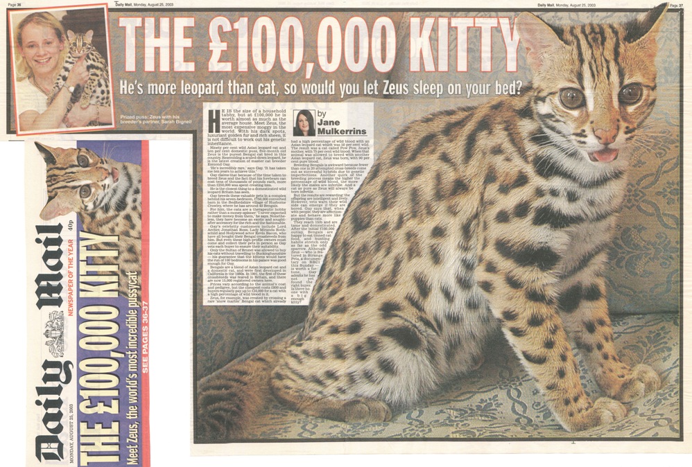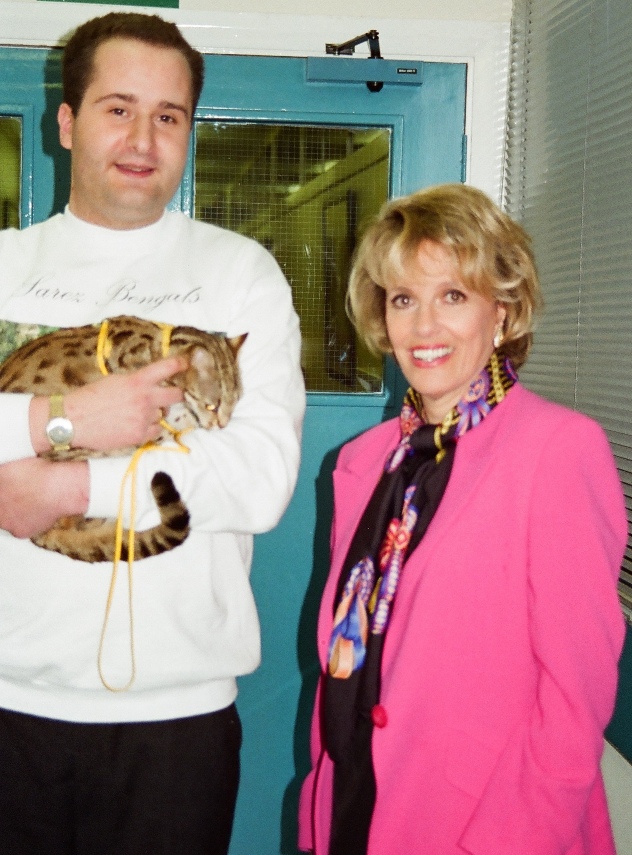 From 1994 to the present, millions of people worldwide have seen our Bengals on about 35 TV programmes and in over 100 newspapers and magazines (some of which are on the internet). And all this publicity has certainly created many new Bengal admirers, something that benefits all breeders. As for us, well, our cats have introduced us to some amazing people from all parts of society; from everyday people (who make up most of our clientele), to cat lovers who can’t afford a pedigree cat (to whom we sometimes give kittens away free of charge), to the landed gentry such as Lady Miranda Rothschild (from the famous banking family), to the super-rich such as Louis Bacon (multi-billionaire hedge fund manager), as well as to a dazzling list of TV stars.