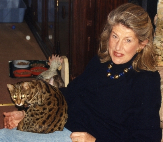 On one of her many visits to us, one image that always makes me smile is of Lady Nourse sitting on our living room floor, playing with our tame F1 male, Occie - he loved being passionately stroked by her and responded by suckling her fingers and scratching at the soles of her shoes - a favourite pastime of F1s. And, with no care for her expensive designer clothes, he’d stalk her and then pounce on her, causing her to cry out in both surprise and amusement. She was smitten, as was he! Occie’s generation is as close to the wild that a Bengal can get and normally they only go to one person and avoid strangers - but his “mum”, Sarah, had told him that Lady Nourse was safe and he trusted her word.