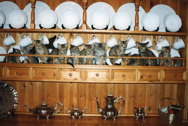 Then one of our photos flashed up on the studio monitors, showing several litters of our kittens perched precariously on our beautiful pine dresser, amongst a £5,000 Wedgewood dinner service. This was not a posed image, but it did portray the typical mischief that numerous cats get up to when living together! I had walked into the kitchen one evening and there they were, one kitten having copied another until they were all lined up in a row.