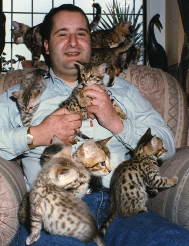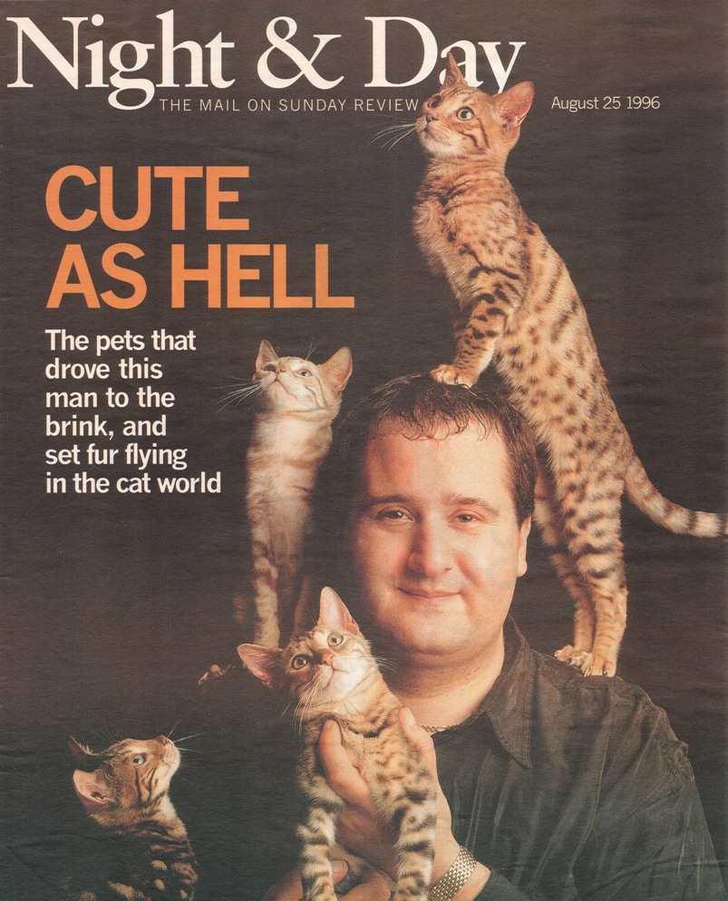 The media refers to Louis Manzi as the “Richard Branson of the South”, and the name does betray the multi-millionaire nightclub owners’ success. Lou’s wife, Marion, saw us and our Bengals in a front page feature in The Mail on Sunday, and they came to visit in September 1996, choosing two F2 kittens, a brown marble named Sarez Mouffassa and a brown spotted called Sarez Jambo.